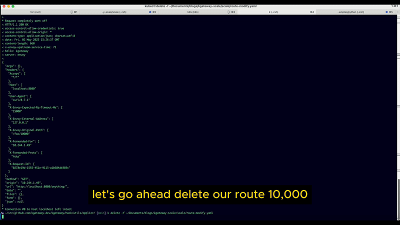 curl http://localhost:8080/foo/10000 -v- Delete the 10,001st route, and confirm the route is no longer functional: